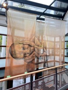Sore tekent grootschalige zelfportretten op transparant kaasdoek, waarin de fragiele stof en de rauwe emotie elkaar versterken. De doeken reageren subtiel op lucht en beweging, waardoor ze bijna lijken te ademen.  Zo ontstaan installaties die niet vastleggen, maar voelen. Intieme, veranderlijke reflecties op wat het betekent mens te zijn.